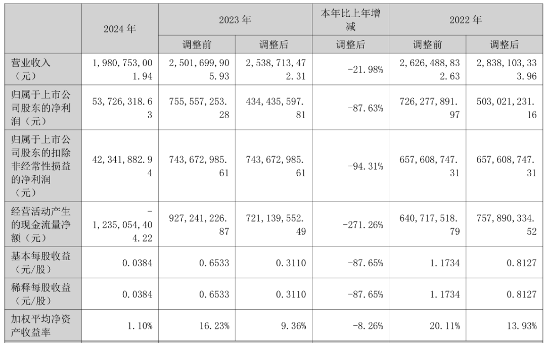 进入2024年,公司营收进一步降至19.81亿元,同比减少21.98%;归母净利润仅5372.63万元,同比下滑87.63%。