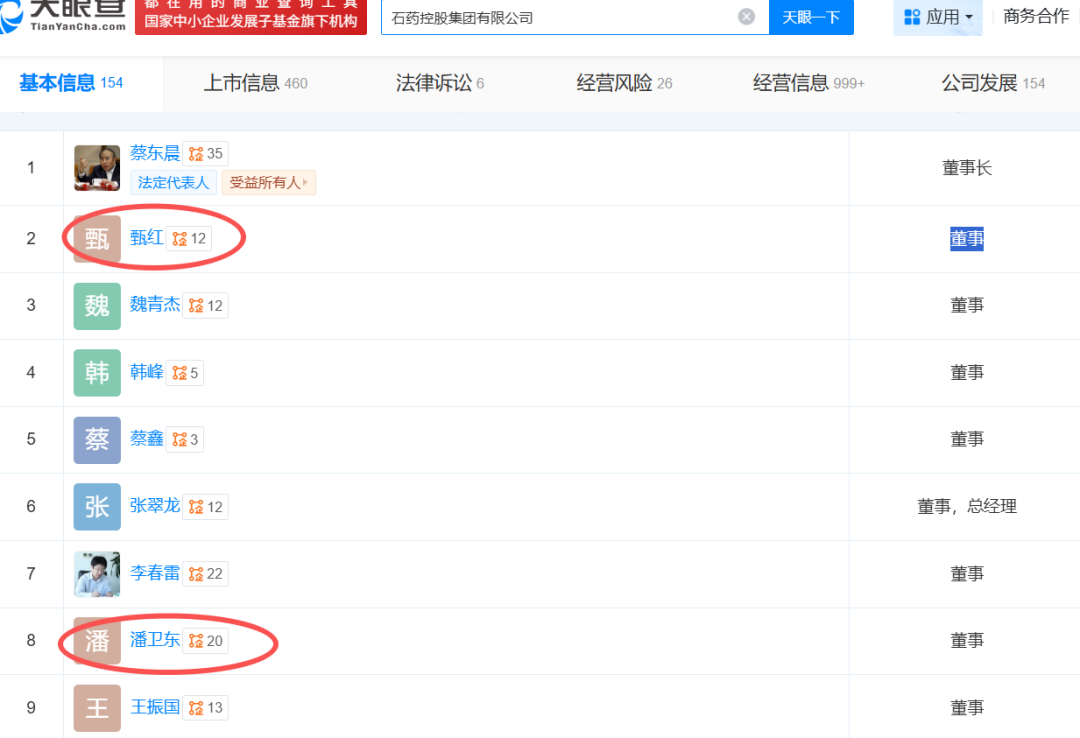据天眼查,石药控股董事名单中,甄红和潘卫东的名字赫然在列。